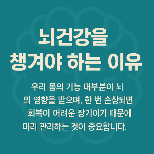 우리 몸의 모든 기능은 결국 뇌에서 출발합니다. 기억력, 사고력, 판단력은 물론이고 감정 조절, 수면, 식욕, 운동 능력까지 뇌가 건강해야 원활하게 이루어집니다. 그런데 뇌는 다른 장기보다 손상이 회복되기 어렵고, 나이가 들수록 자연스럽게 기능이 저하되기 때문에 미리 관리하지 않으면 큰 문제로 이어질 수 있습니다.